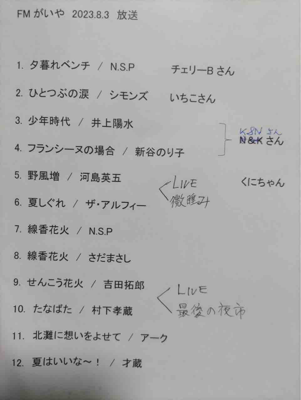 July 31, 2023 全世界に発信される 北灘に想いを寄せて コメント数:0 コメント カテゴリ:ラジオ by エステル 8月3日13時 再放送20時 のFMがいやでアークの北灘に想いを寄せてをかけてくださるそうな。パーソナリティの村田さんから連絡がありました。いつも吉田拓郎やさだまさしと同レベルでかけてくれてありがとう(((笑村田蔵六とフォークを語ろうは毎週木曜日13時と20時から全部自分が持ってるCDやレコードからかけてると思いますよ。全世界で聴けます。ネットでやってるから・・・ぜひ、聞いてみてくださーい!今日の楽しい気持ち村田蔵六とフォークを語ろうは楽しい